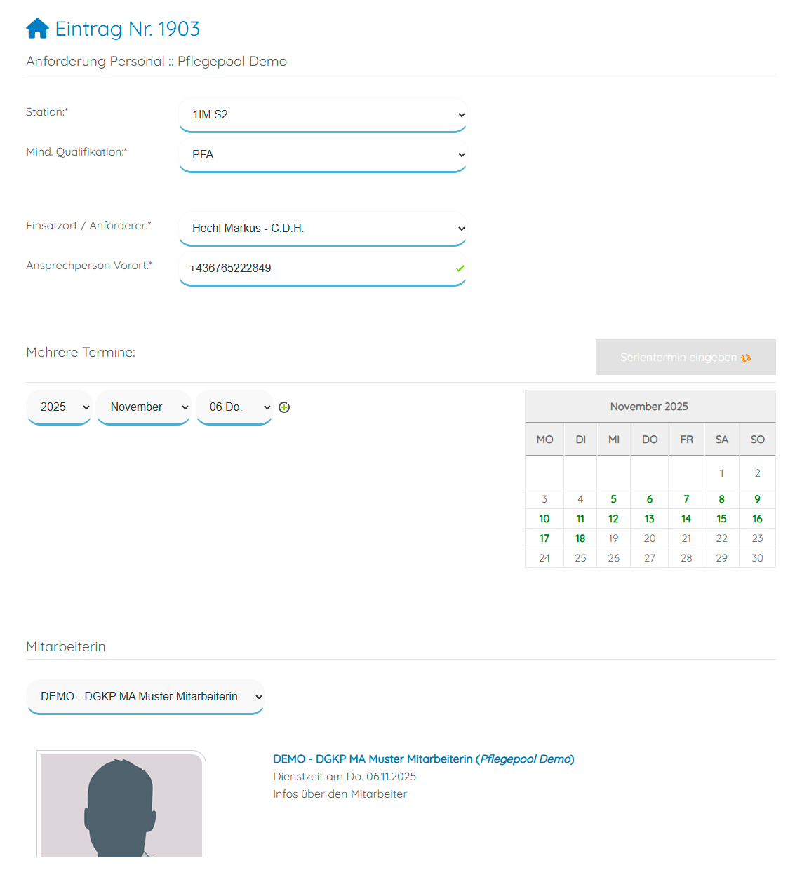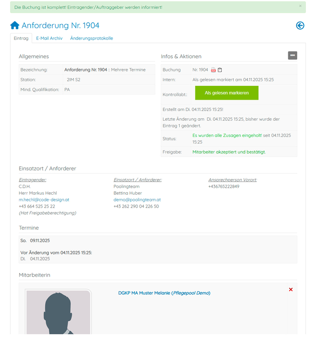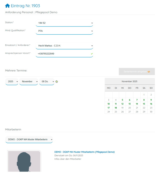 • Für Stationen: Unkomplizierte Anforderung von Pflegekräften und Rückverfolgbarkeit, ggf. Änderung von Anforderungen oder Stornierungen bei gleichzeitiger Information aller Beteiligten. Anforderungsbestätigung mit Doppelbuchungsschutz!